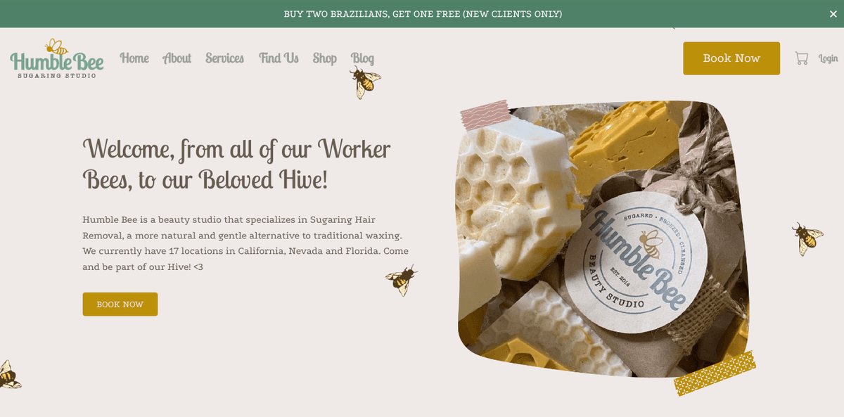 This MySite is the epitome of cohesive branding, with decorative elements consistently reinforcing the brand identity throughout the entire design. It showcases clear CTAs for a "download branded app" button to help enhance the user experience, and also lists all of the Humble Bee locations in the footer, adding convenience for clients. Awards are also shown front and center to bolster credibility, while a clear "Book Now" call-to-action encourages viewers to schedule a service.