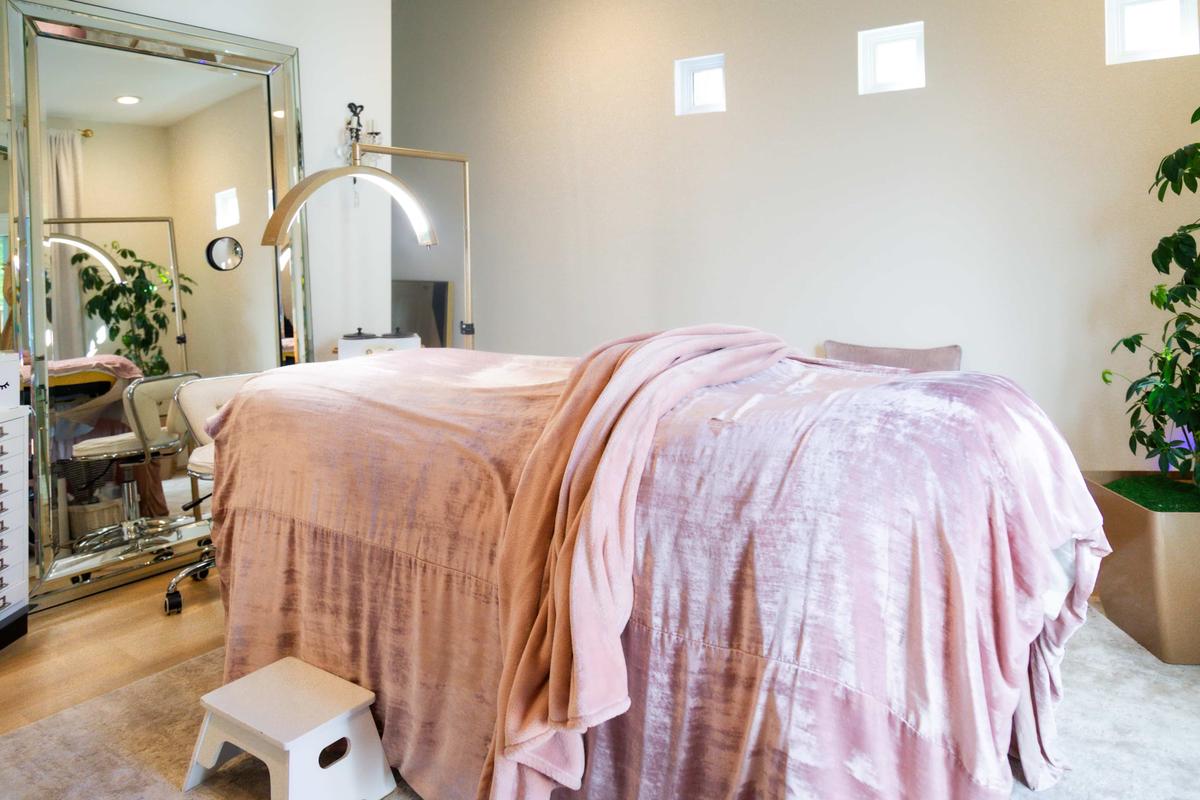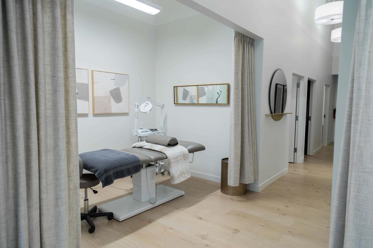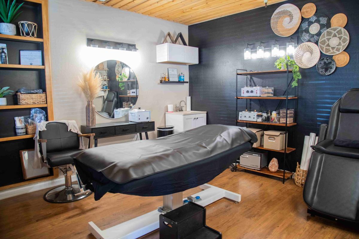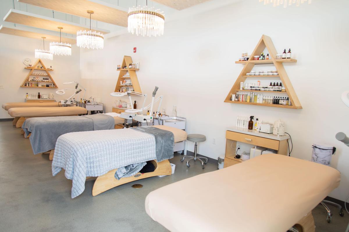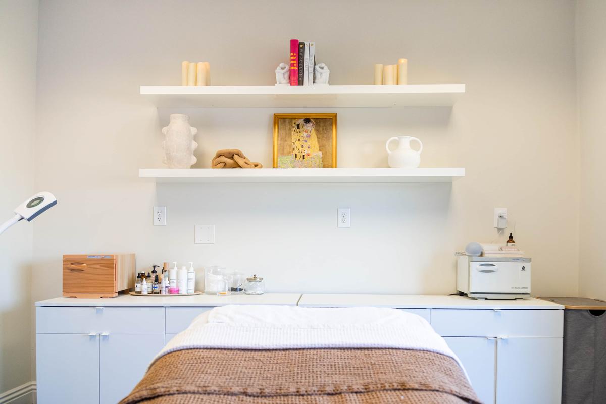 Soft, muted tones and natural textures create a serene, grounded environment. Clients immediately feel calm and focused on their self-care experience.