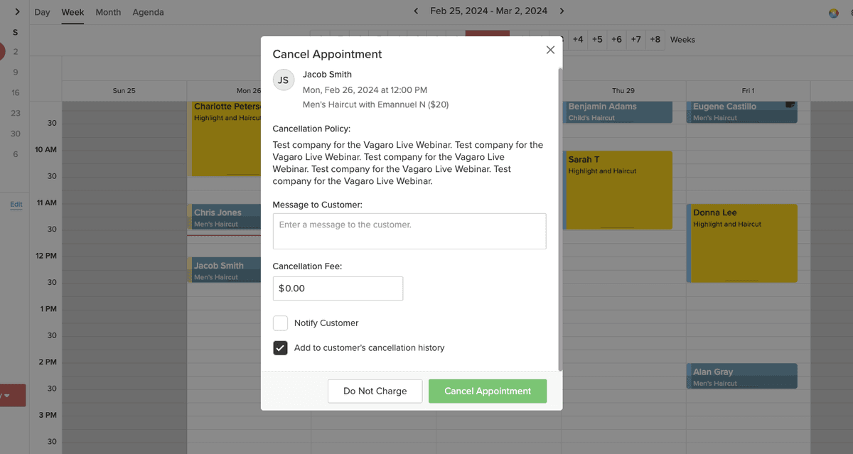 We’ve covered some ways Vagaro makes your life easier than GlossGenius, but let’s take it a step further, and talk about something even more maddening: pointless switching between settings. A quick question for GlossGenius users: Why does it take extra clicks or back and forth navigating to charge someone a cancellation fee? Vagaro allows you to set a default cancellation fee percentage or amount for all bookings, but also automatically provides you with the option to charge a custom fee after marking an appointment as a cancellation or no-show.