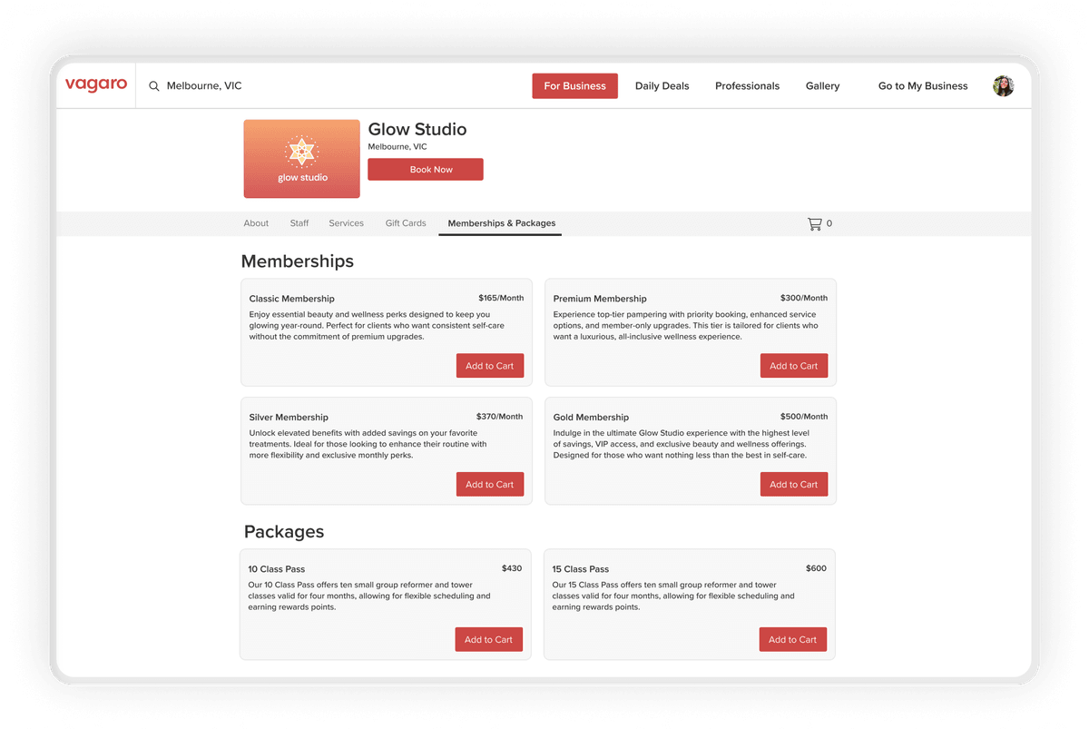 Vagaro automatically highlights membership savings when clients book participating services or classes. This helps customers get more value while boosting loyalty and revenue.