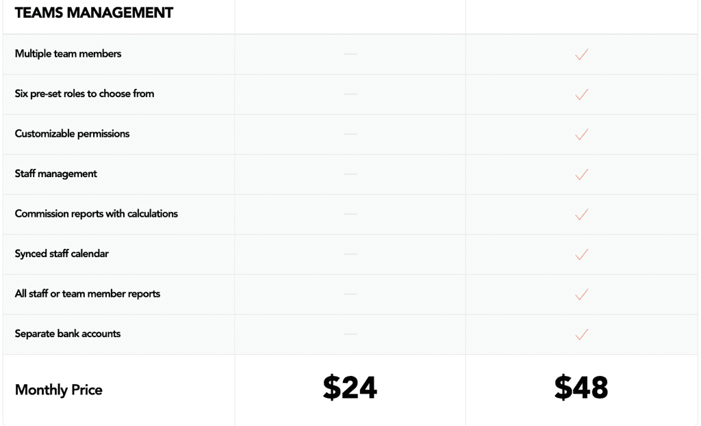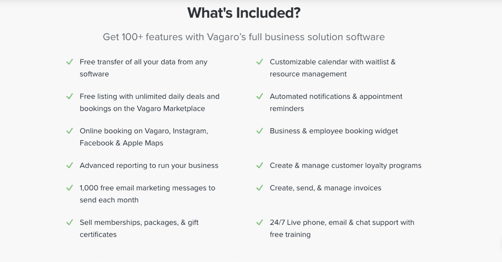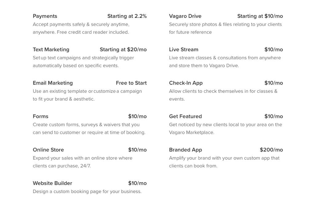 Beyond what is included in their base plan, Vagaro’s approach is to give businesses the option to choose features that are most useful and important to them by providing an à la carte feature structure, rather than having them upgrade to a more expensive plan that bundles added features they don’t need. In this way, you only pay for what you need & use with Vagaro.