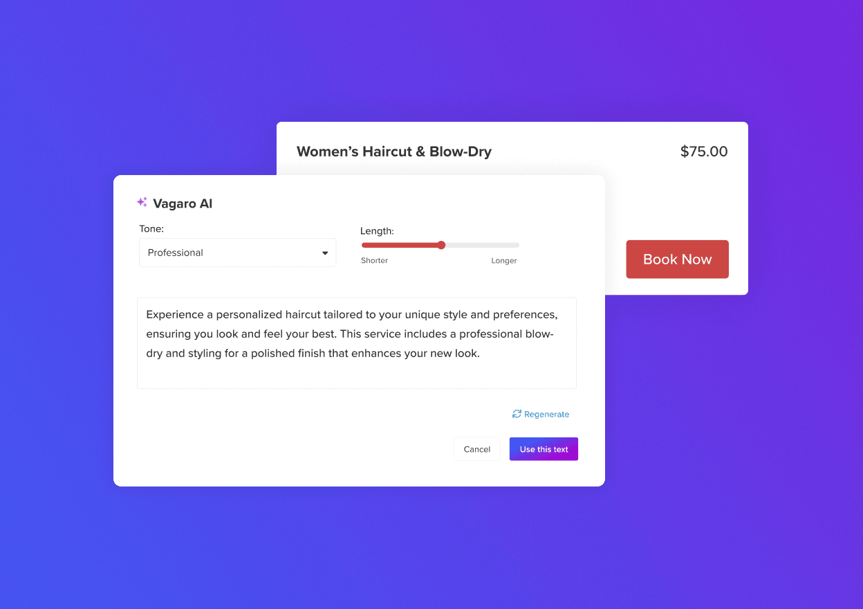 Yes. Vagaro AI offers a range of tones—such as professional, casual, friendly, or uplifting—and allows you to adjust the level of detail to match your brand’s personality. This flexibility makes it easy to ensure that every piece of content, from service descriptions to staff bios, aligns with your business’s voice and communicates with the tone you want clients to experience.
