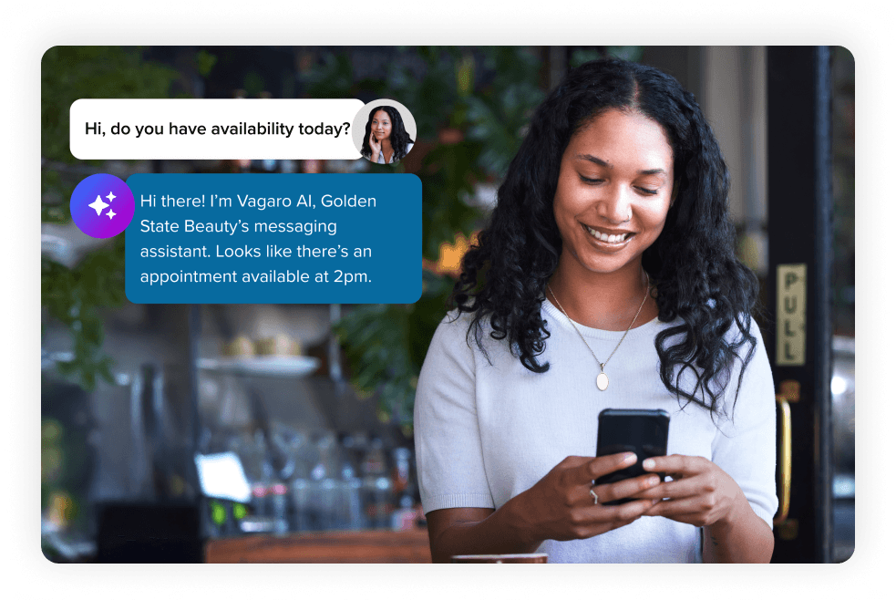 Yes. Vagaro AI powers a built-in messaging chatbot within Connect by Vagaro, allowing your business to automatically respond to clients 24/7 or on a schedule you choose. The chatbot can answer common questions about your business, provide appointment information, cancel appointments, and display personalized details such as past purchases or membership status.