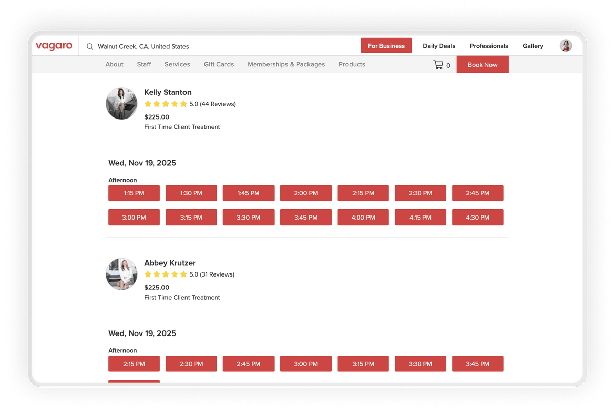 An online booking system is scheduling software that allows clients to book services anytime through a website or app. With Vagaro’s online booking tools, appointments automatically sync to your calendar, helping you manage bookings, payments, and cancellations from one place.