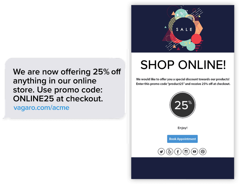 Limited-Time/Flash Promotions: Pairing text marketing with Daily Deals is an effective, time-sensitive revenue booster that gets subscribers to act fast. Additionally, linking text marketing special sales to your online store is a great way to move product bundles, sell gift cards or clear out excess inventory. Want to learn more about your online storefront and how it can help you sell while you sleep? Click in!