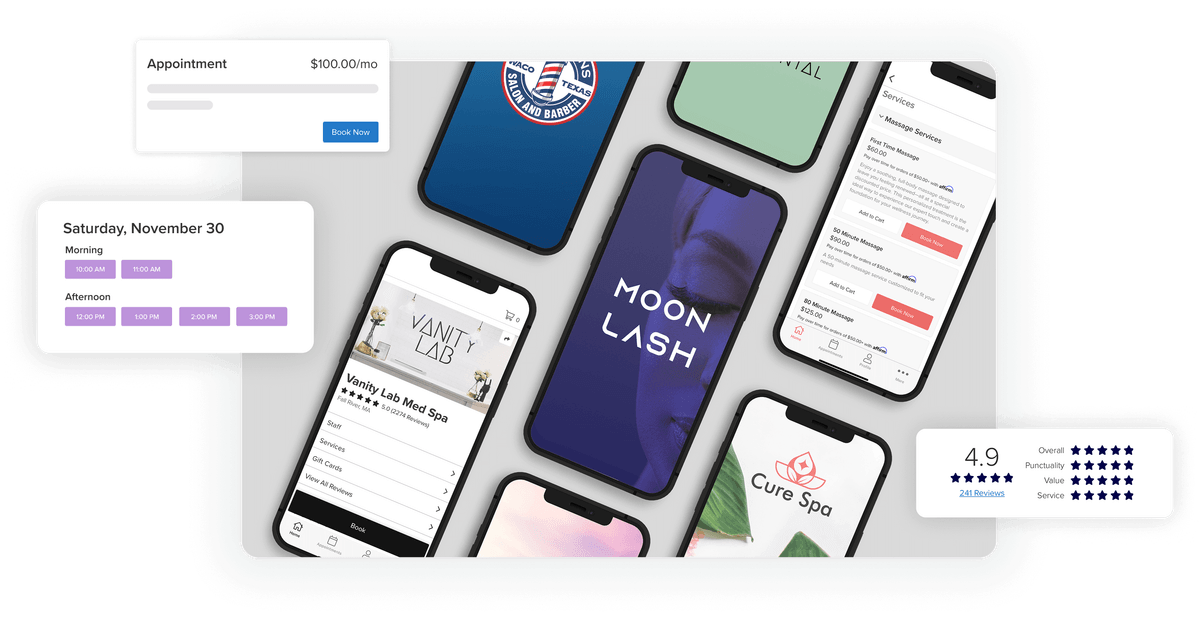 Clients using your branded app can book or reschedule appointments, sign up for classes or workshops, browse your service and class menus, manage their customer profiles (including booking history, payment info, memberships, and past purchases), leave reviews, and shop your online store for products, gift cards, packages or memberships — all from their phone.
