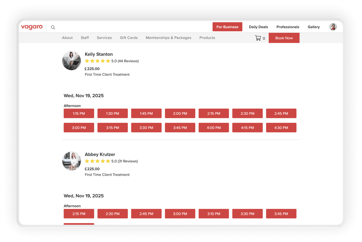 You can enable online scheduling by connecting a booking system to your website or social media pages. With Vagaro, you can easily add a booking link or widget, allowing clients to choose services, see availability, and book instantly.
