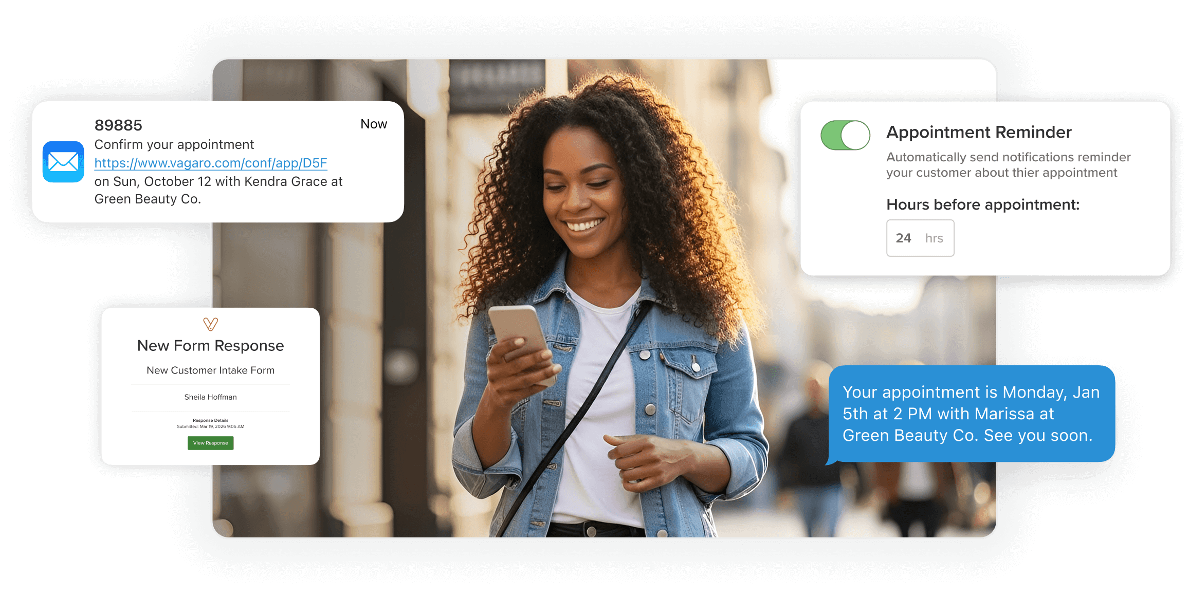 Yes. Automated appointment reminders—via text, email, and app notifications—dramatically reduce no-shows by keeping clients informed at every step. Vagaro’s appointment reminder software also sends follow-up rebooking texts, form reminders, and business updates to improve attendance and engagement.